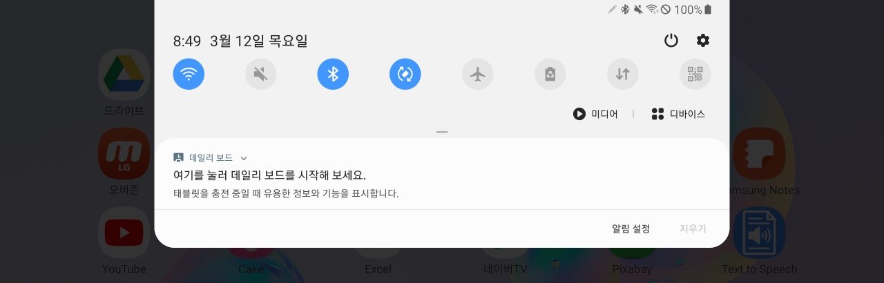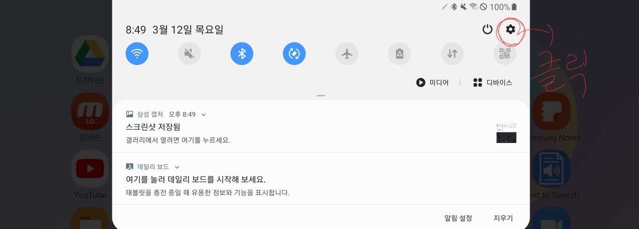 화면을 위에서 아래로 드래그 하면 설정창이 나옵니다.