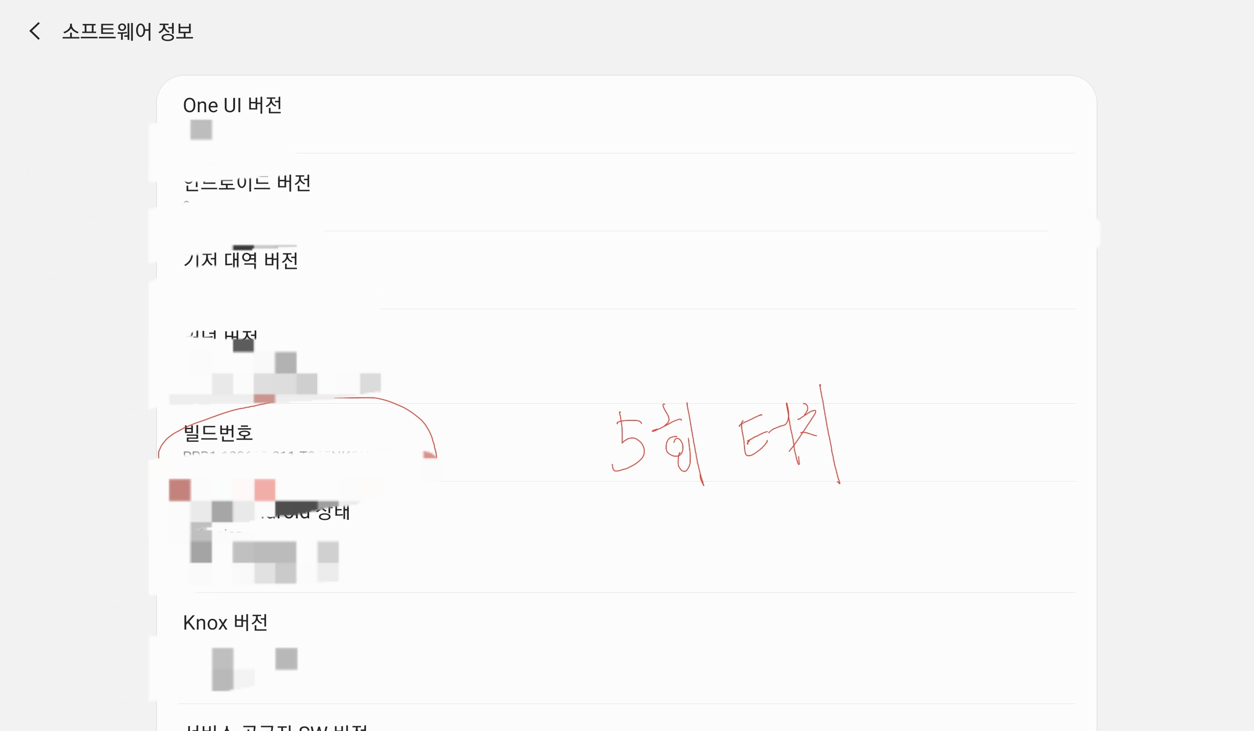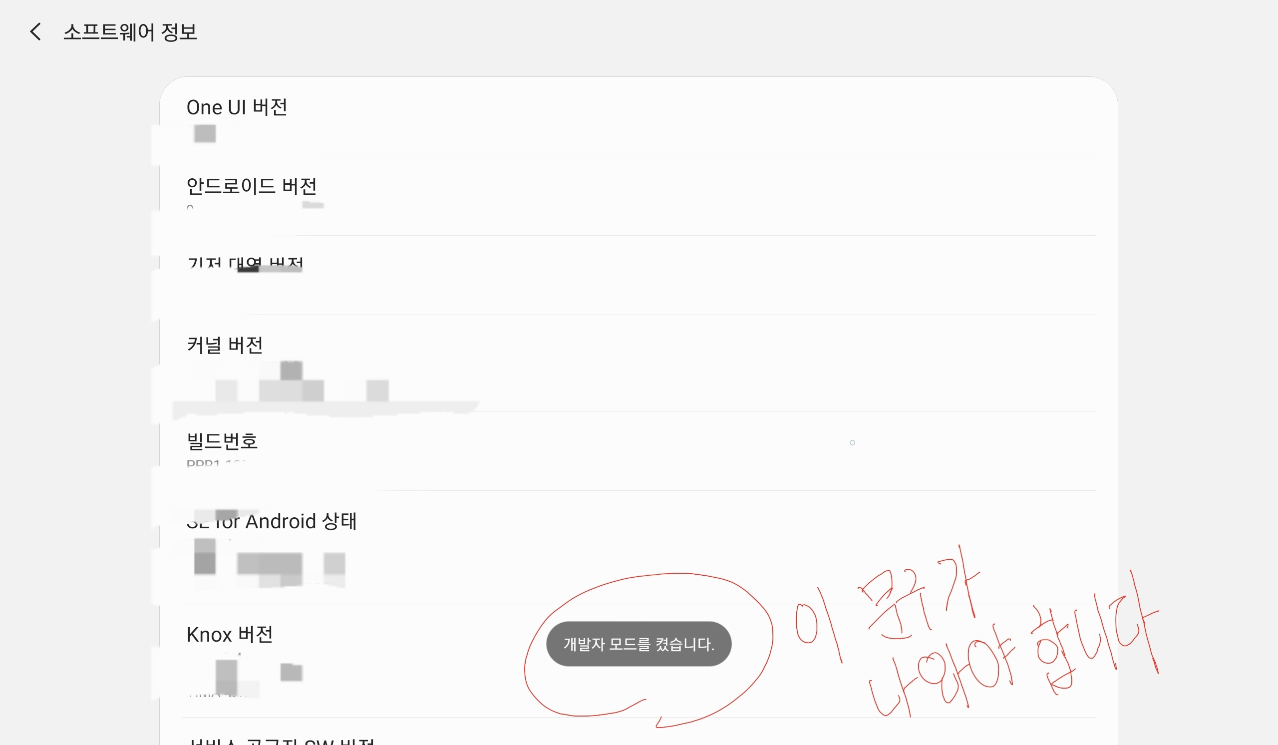 아래에 보면 빌드 번호를 5회~6회 계속 터치하여 줍니다.