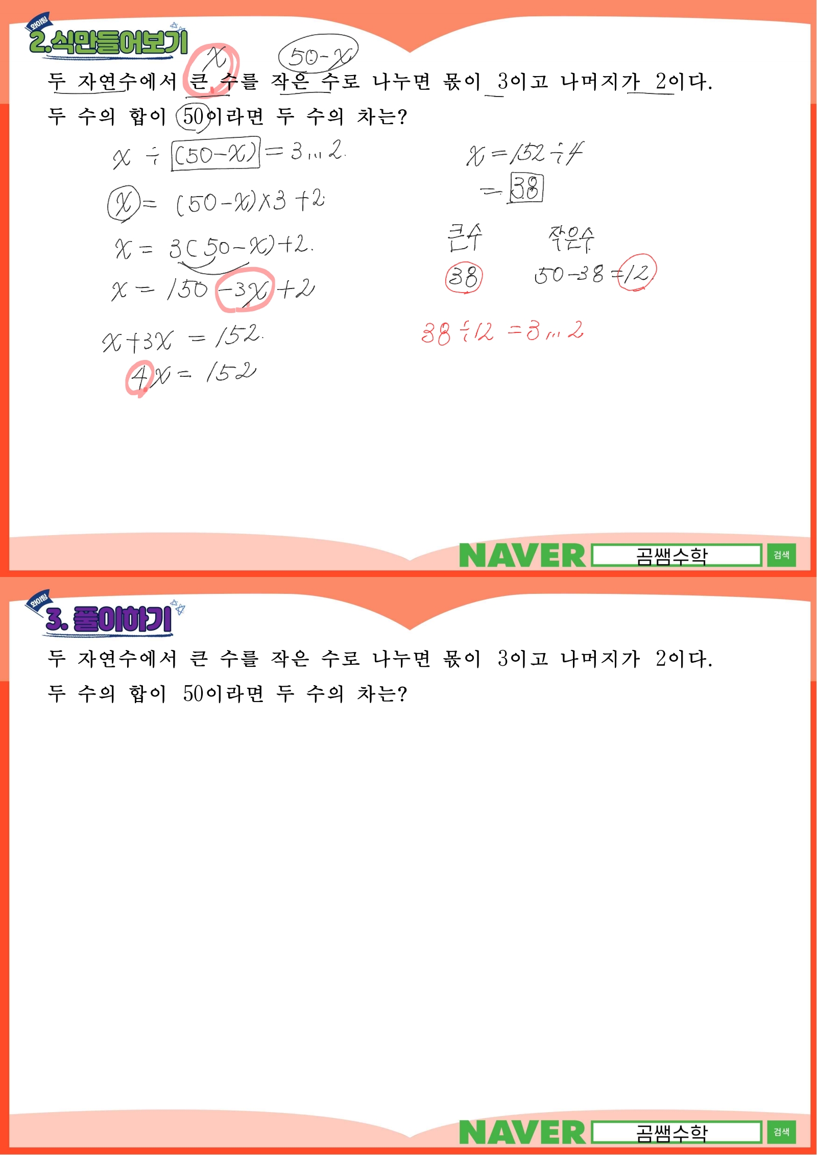 두 자연수에서 큰 수를 작은 수로 나누면 몫이 3이고 나머지가 2이다. 두 수의 합이 50이라면 두 수의 차는?