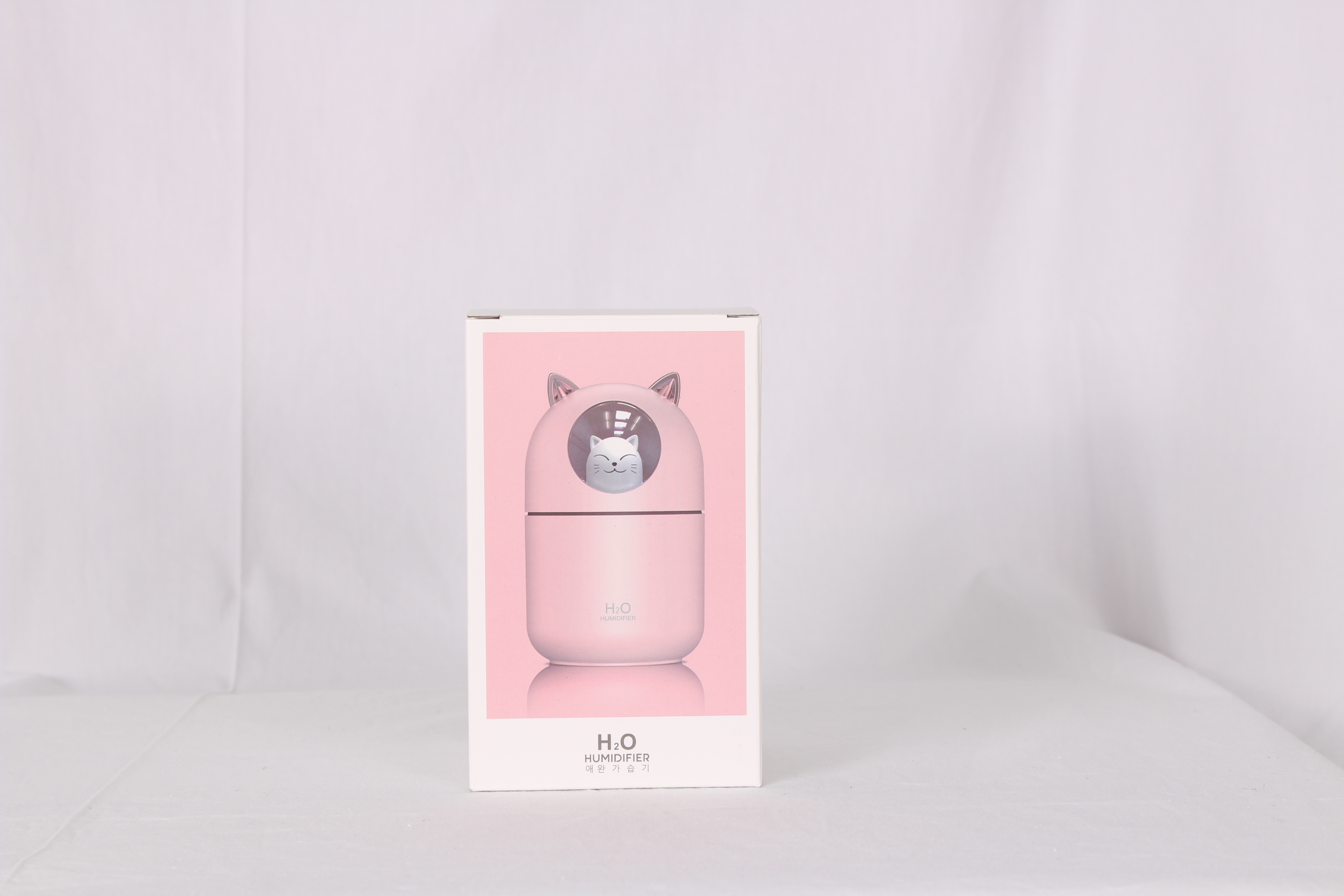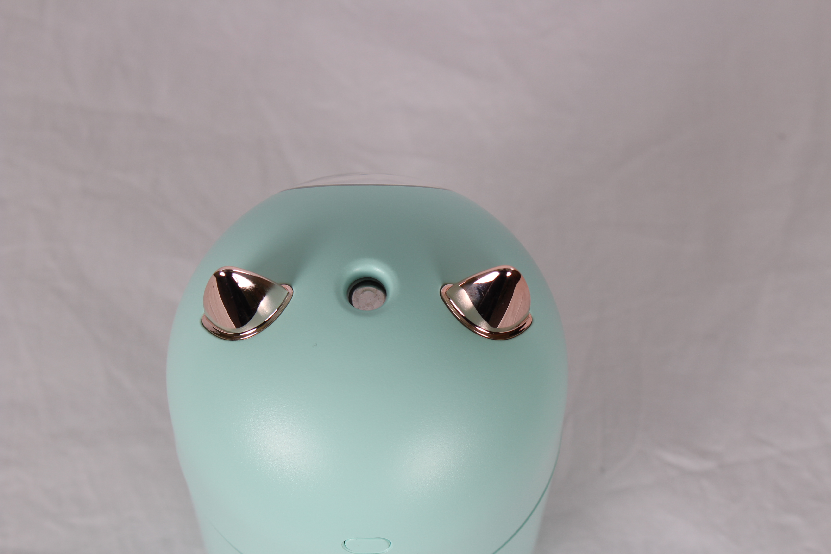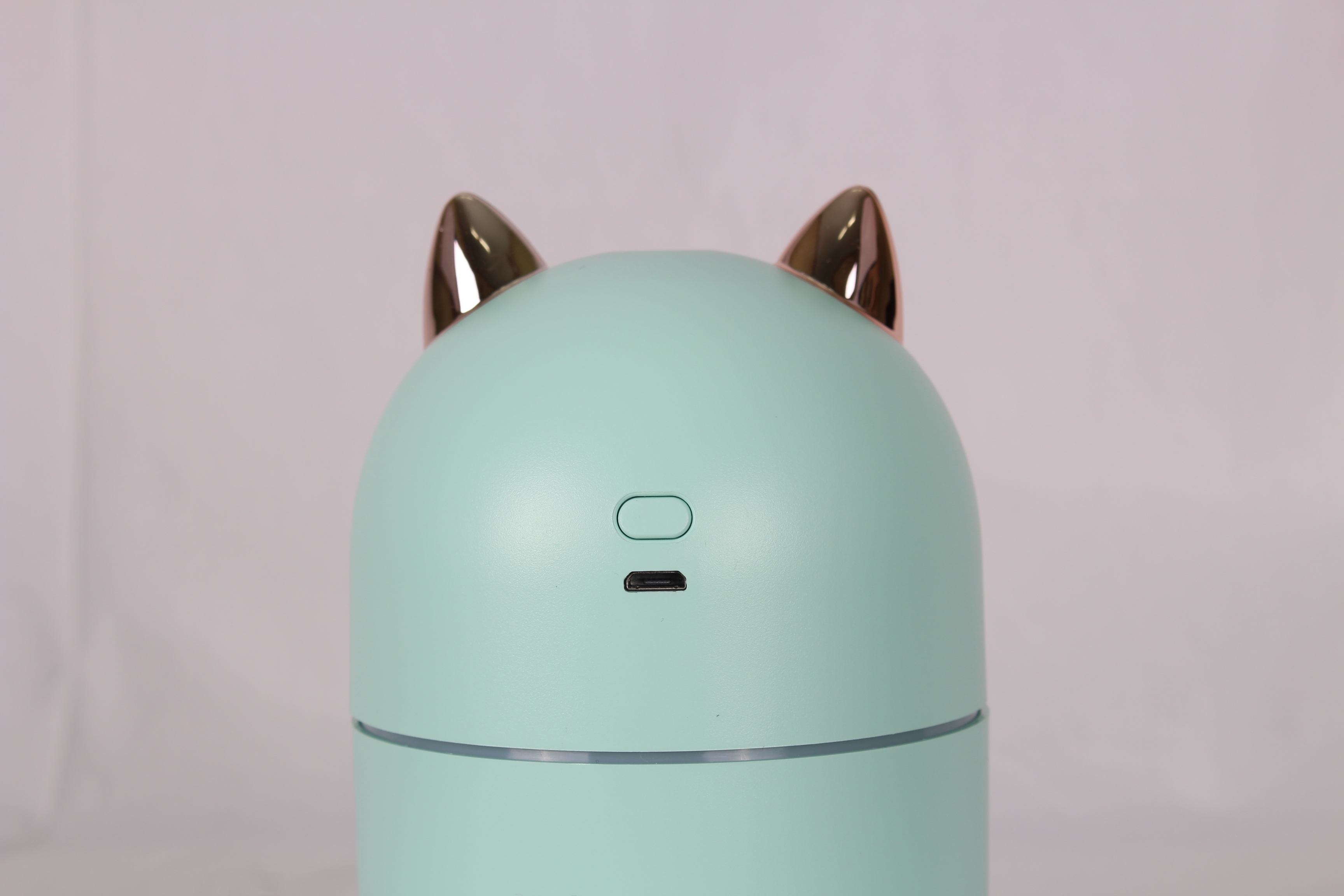전원 버튼 누르면 분무가 시작되고 전원 버튼은 3초 정도 누르고 있으면 고양이 부분에 다양한 색의 led가 들어와요