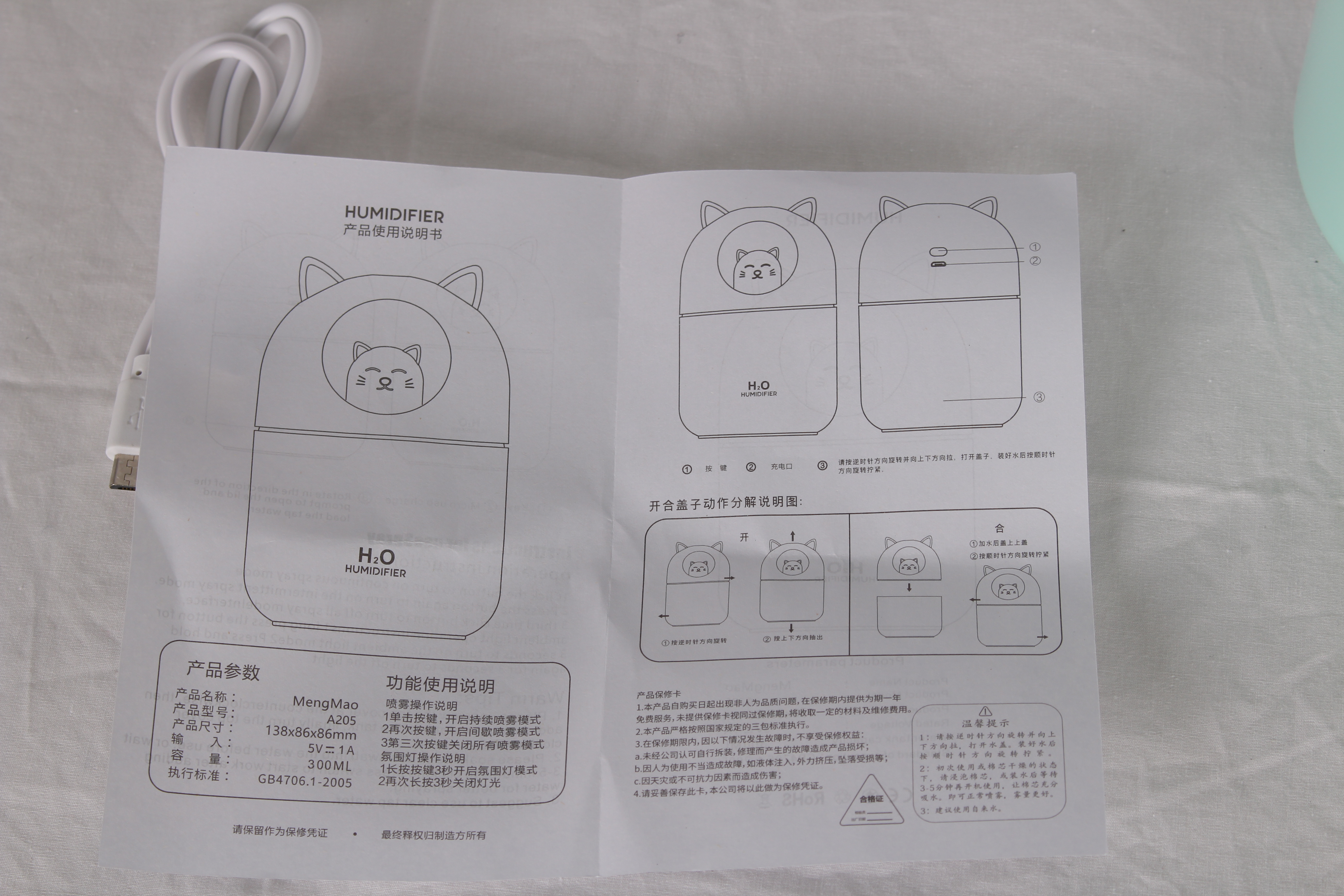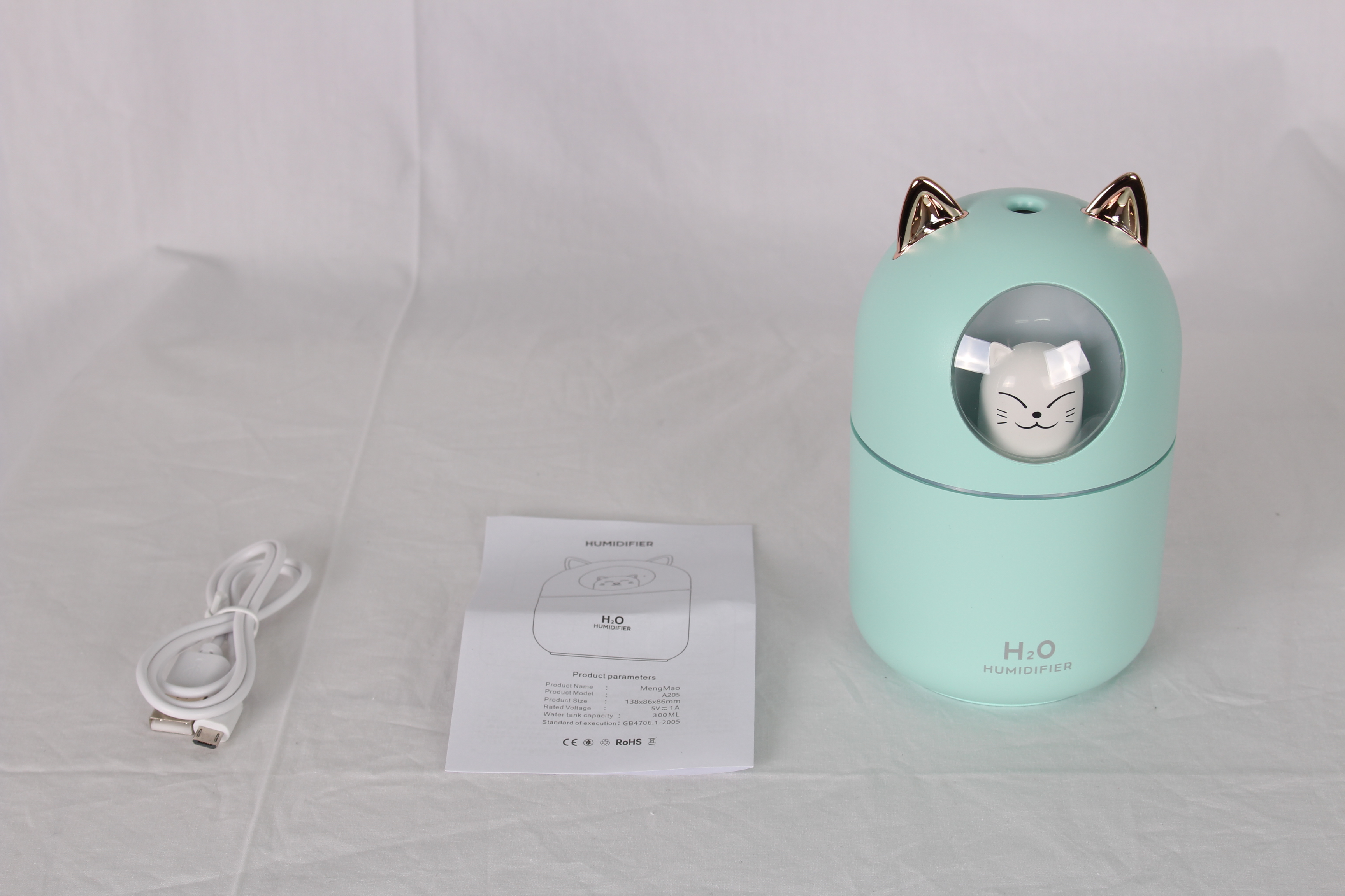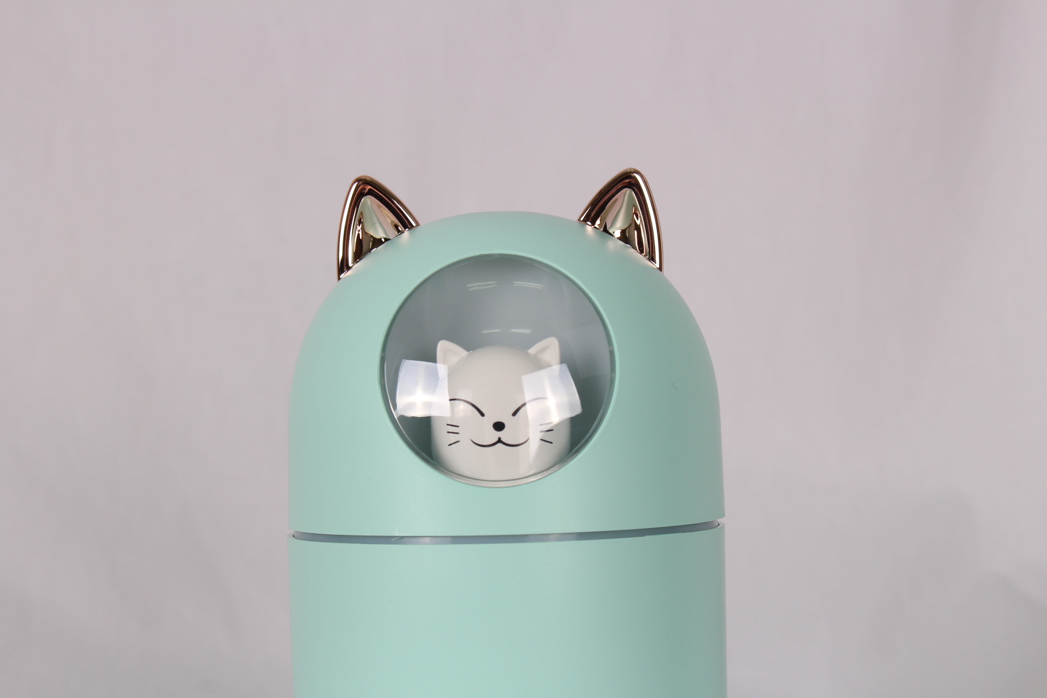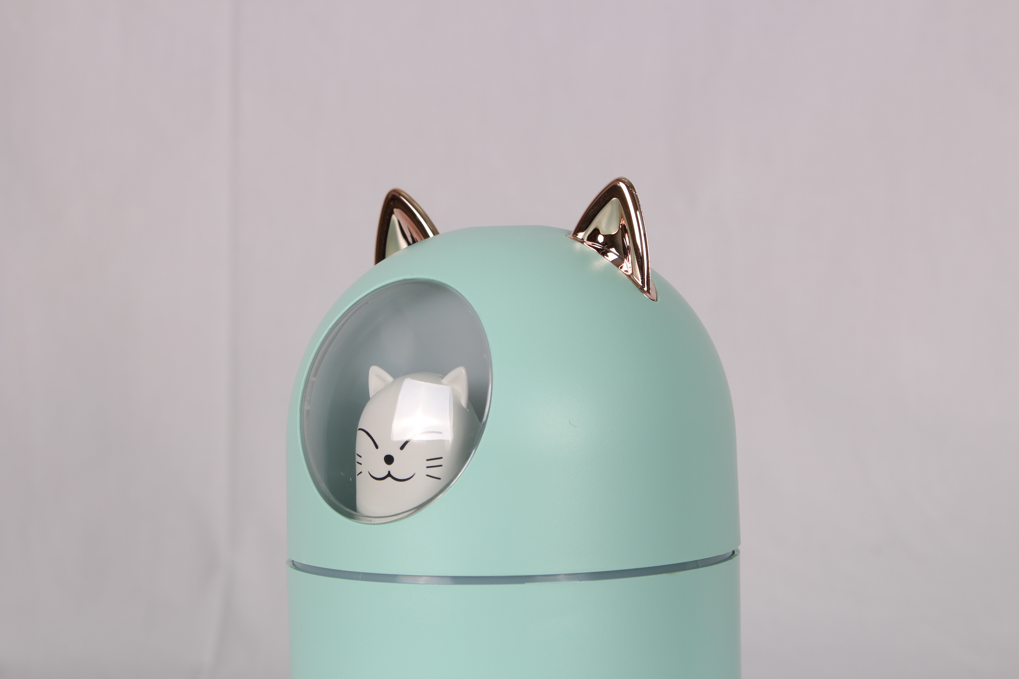 전원 버튼 누르면 분무가 시작되고 전원 버튼은 3초 정도 누르고 있으면 고양이 부분에 다양한 색의 led가 들어와요