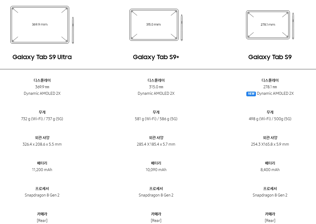 3. 탭s9, 플러스, 울트라 스펙 비교