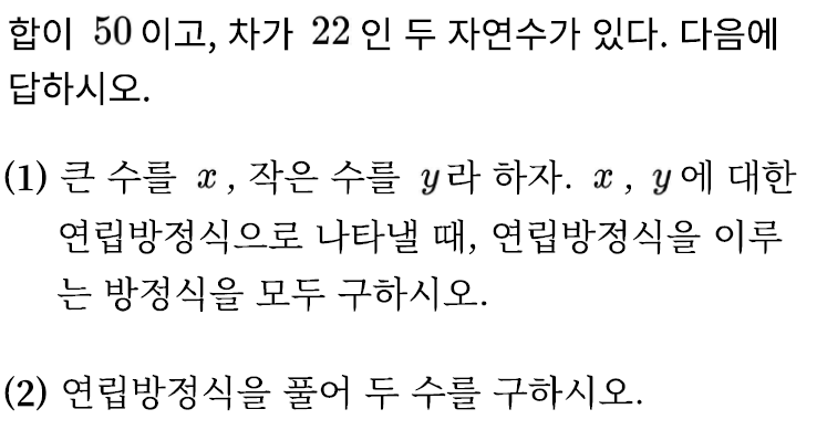 지금 이 문제에서는 큰 수를 x, 작은 수를 y라고 뒀어.