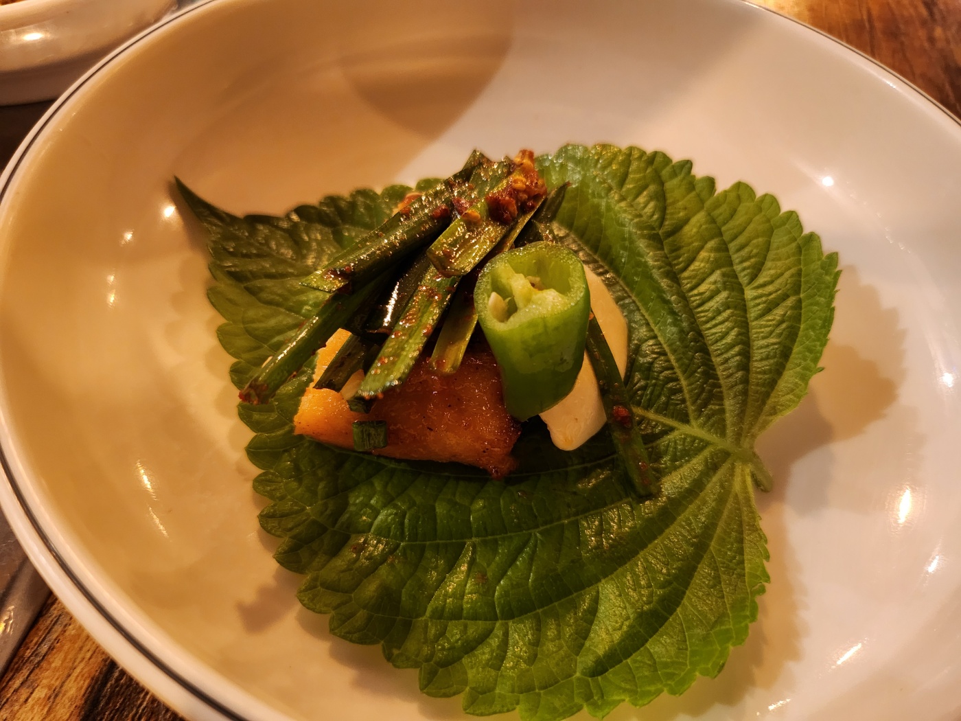 매콤한 양념에 버무린 파무침과 깻잎, 그리고 마늘과 고추까지 다양한 쌈 재료들이 준비되어 있어서, 고기를 쌈에 싸서 먹는 즐거움이 있었습니다.