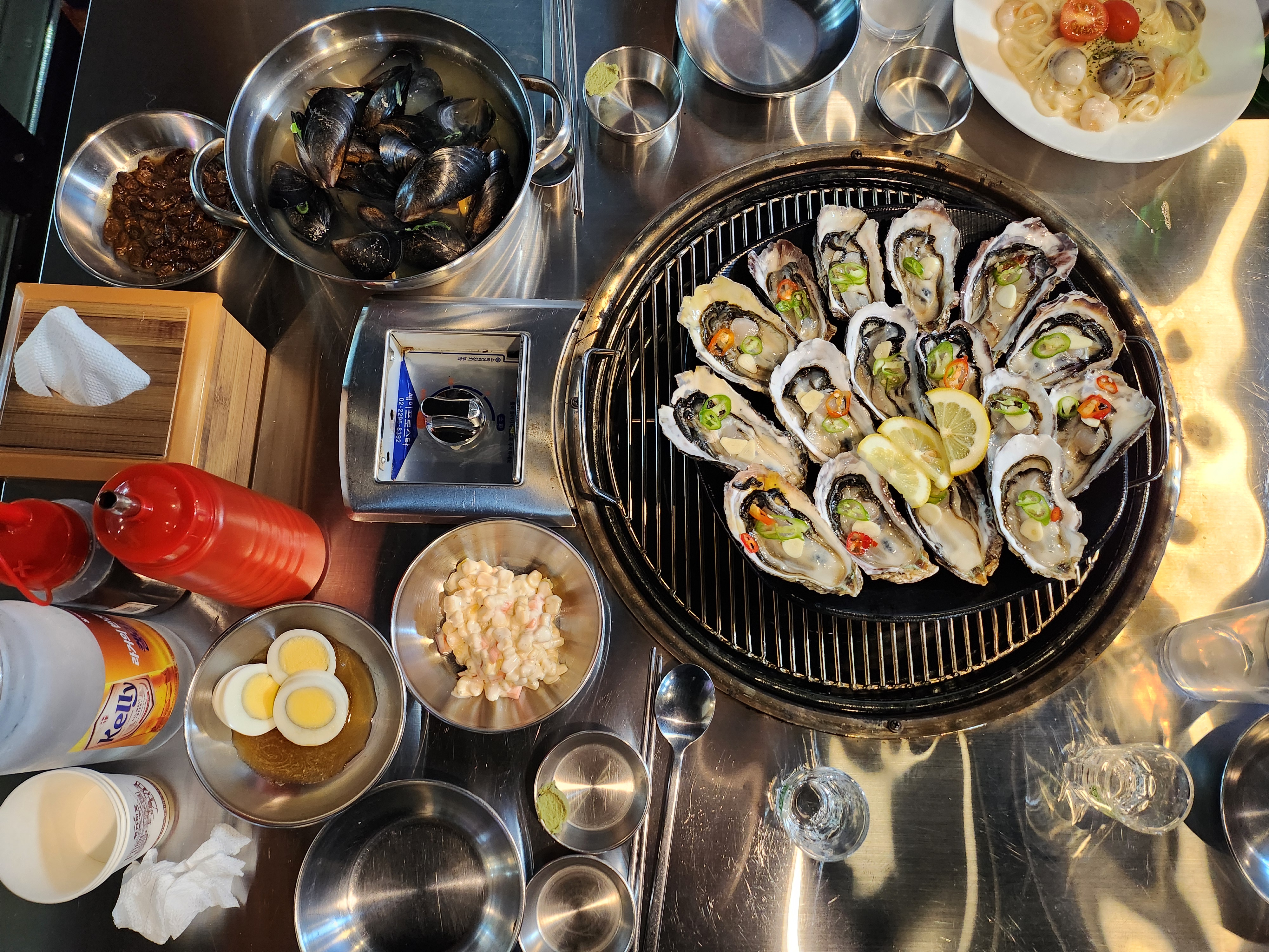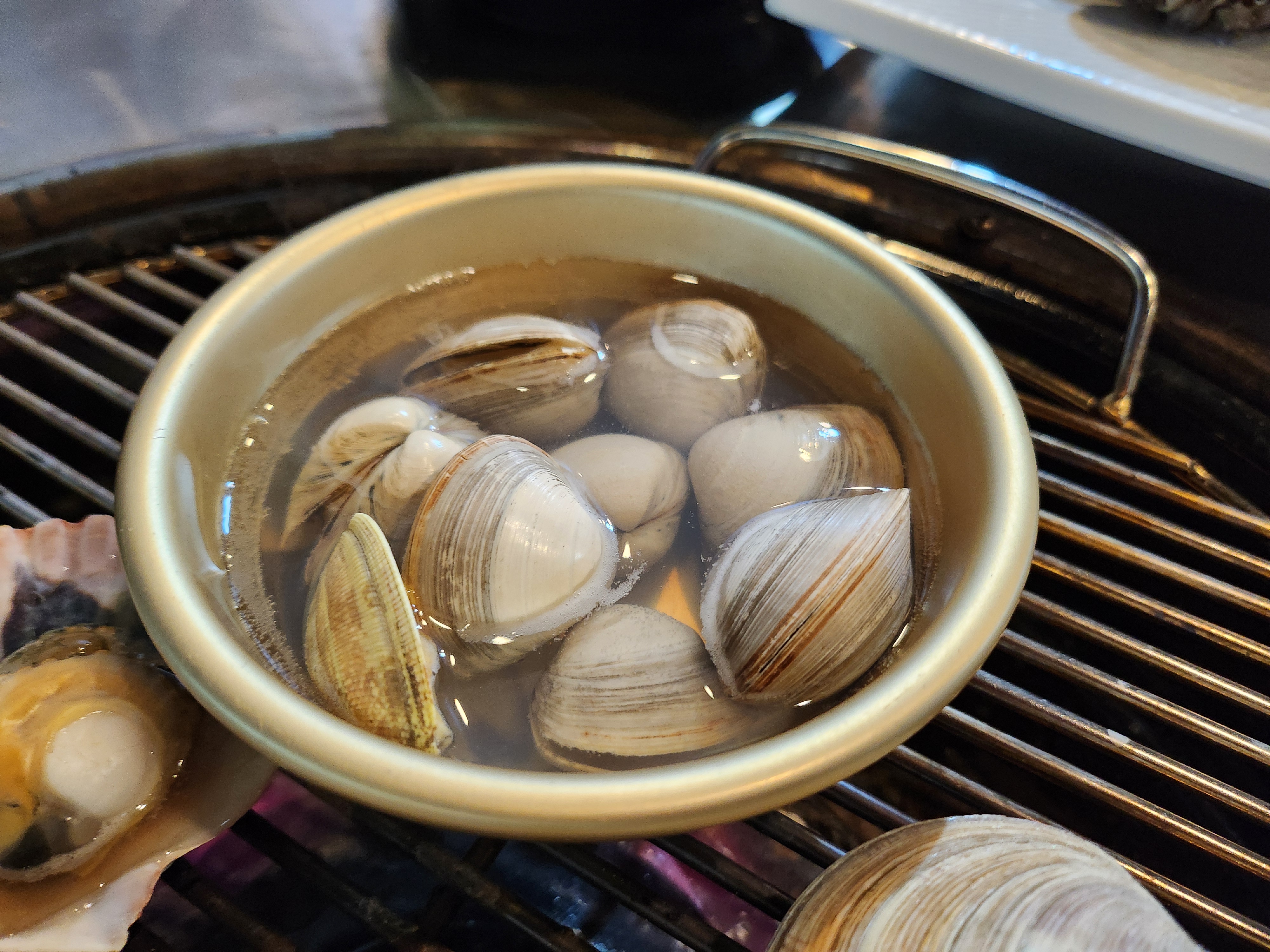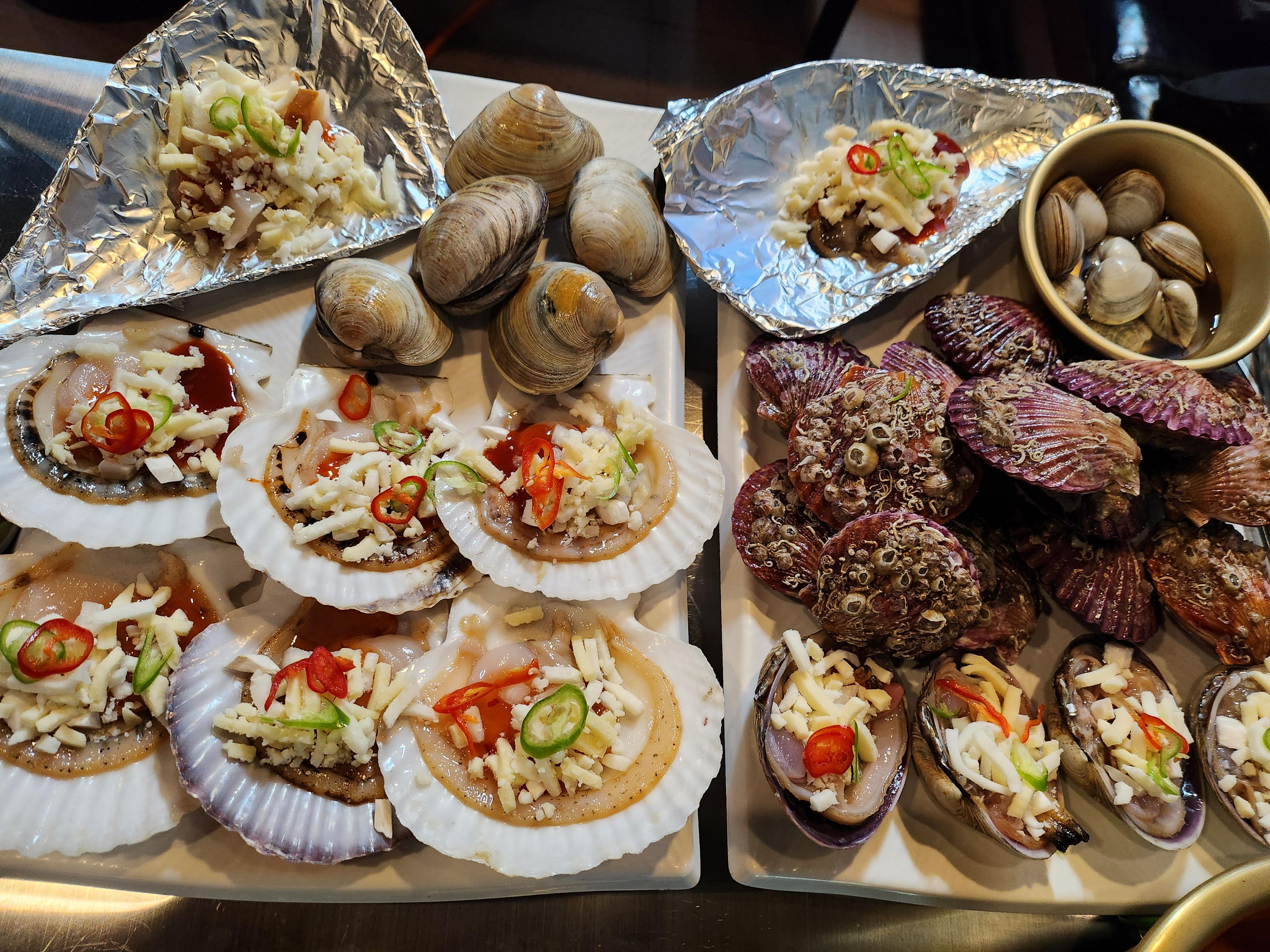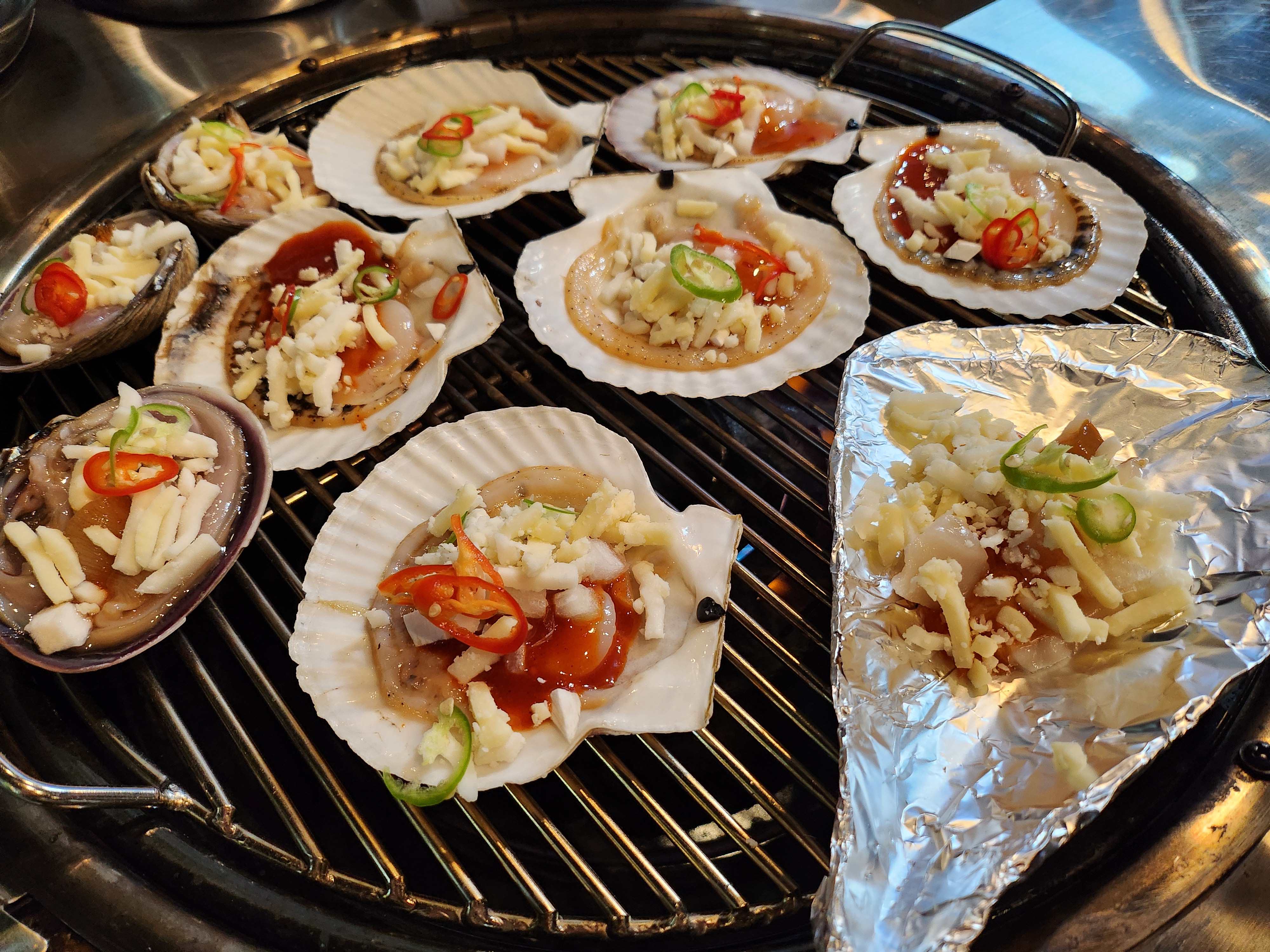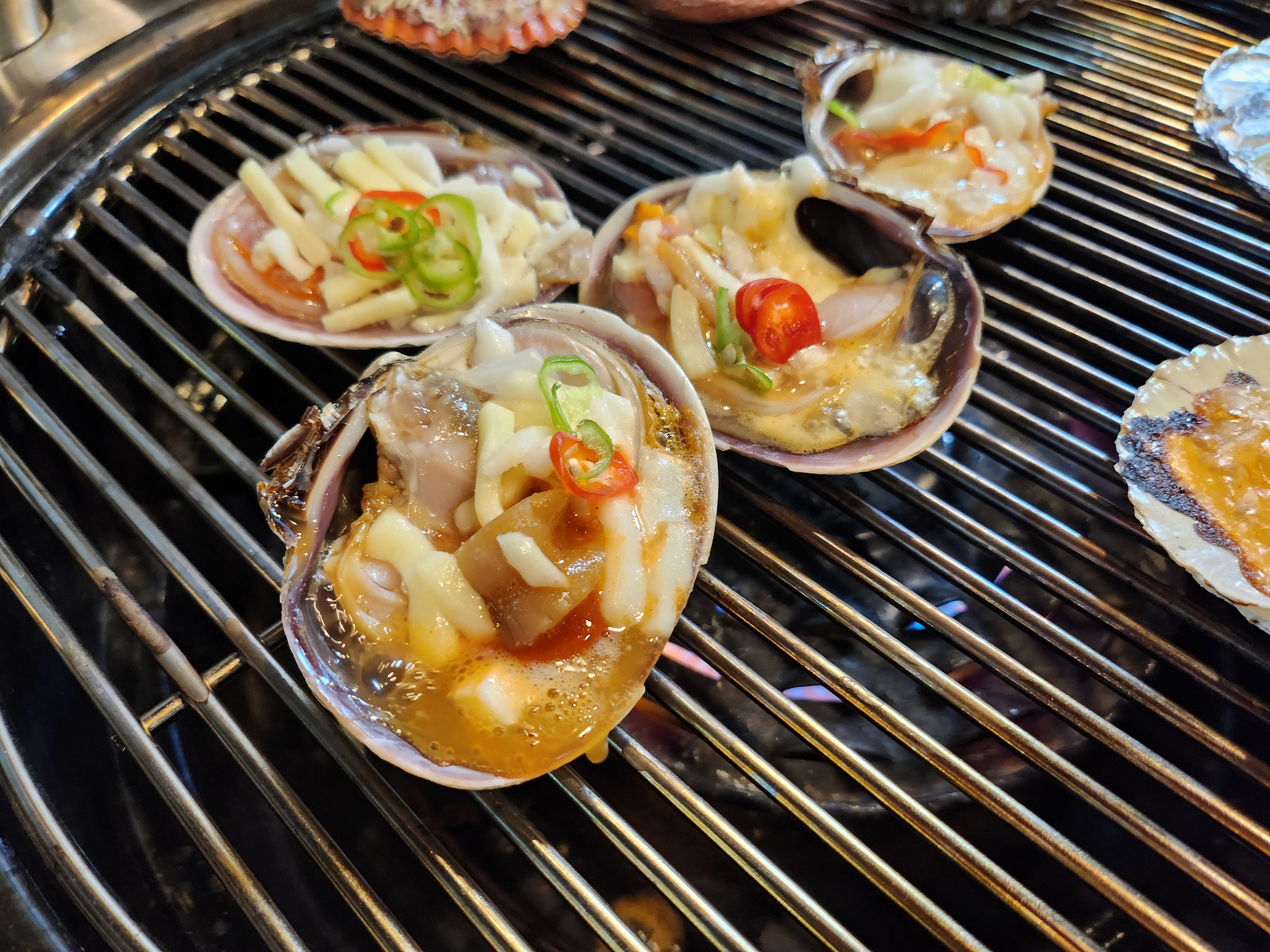 그릴에 올려진 조개들이 지글지글 익어가며 퍼지는 고소한 냄새는 식욕을 자극하기 충분했어요.