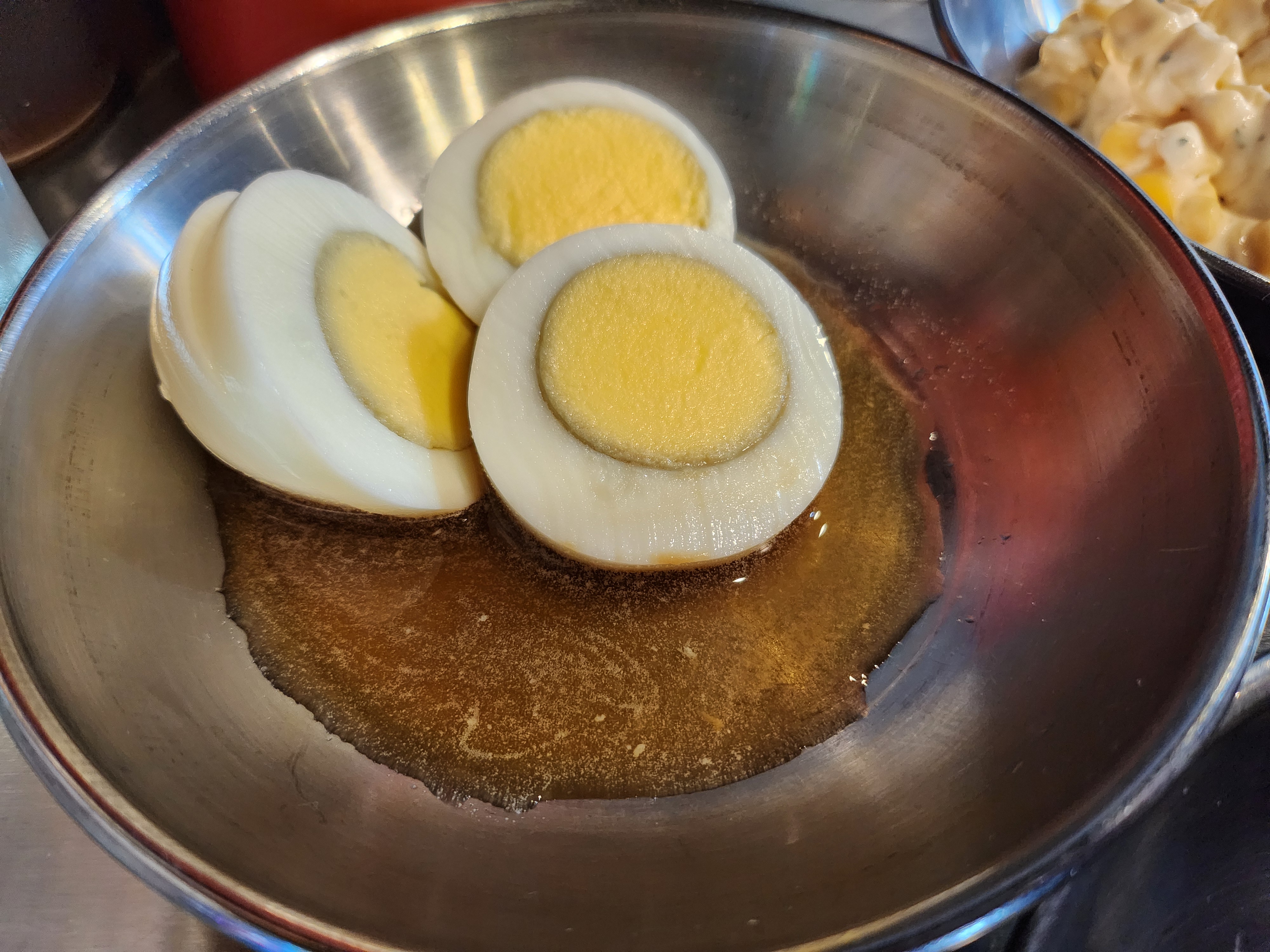 먼저 단단하게 삶아진 계란은 짭조름한 간장 양념과 함께 제공되었는데, 담백하면서도 깔끔한 맛이 석화와 잘 어울렸어요.