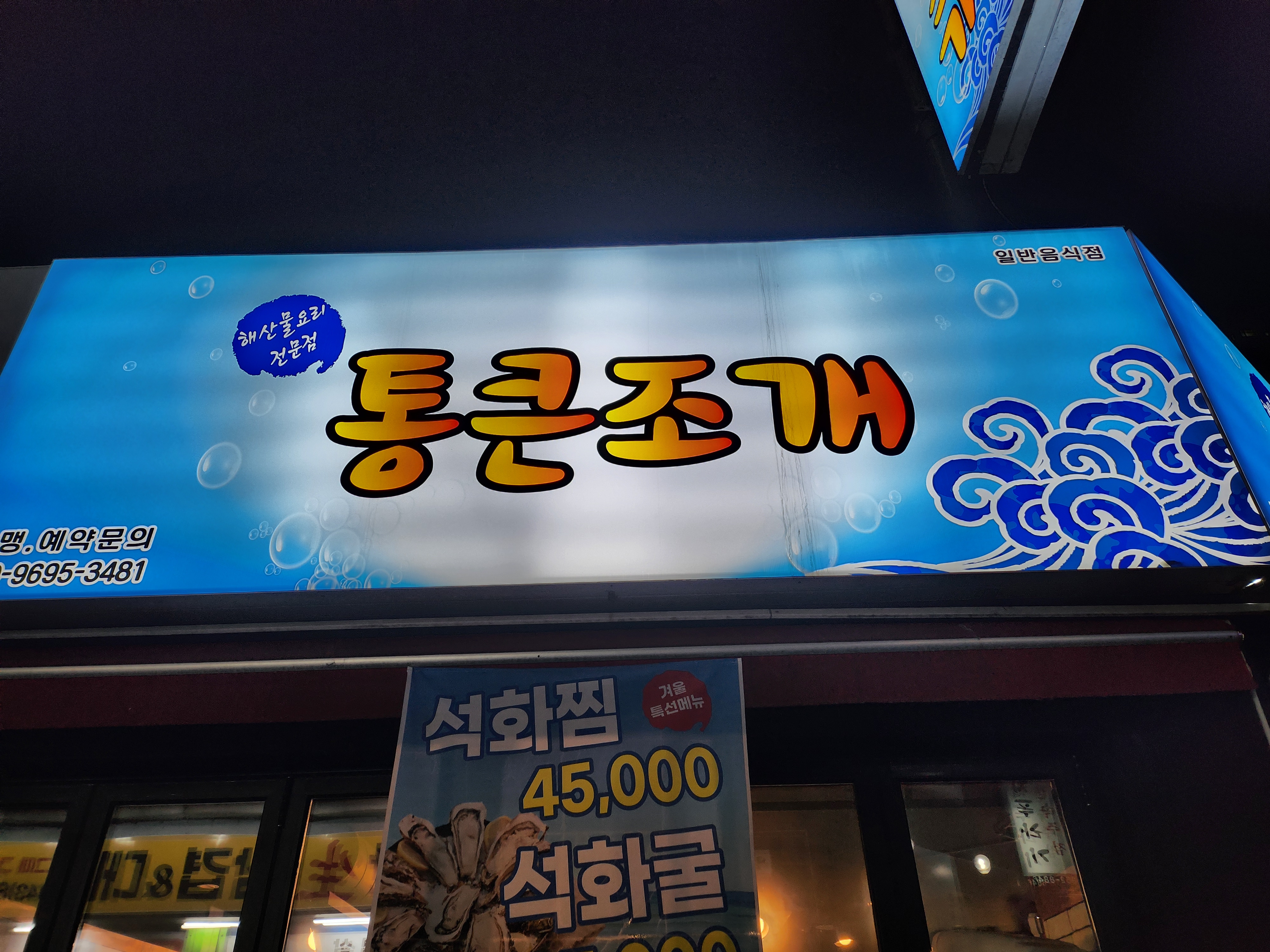 "통큰조개"라는 이름처럼, 해산물의 신선함과 푸짐함을 기대하게 만드는 분위기였습니다.