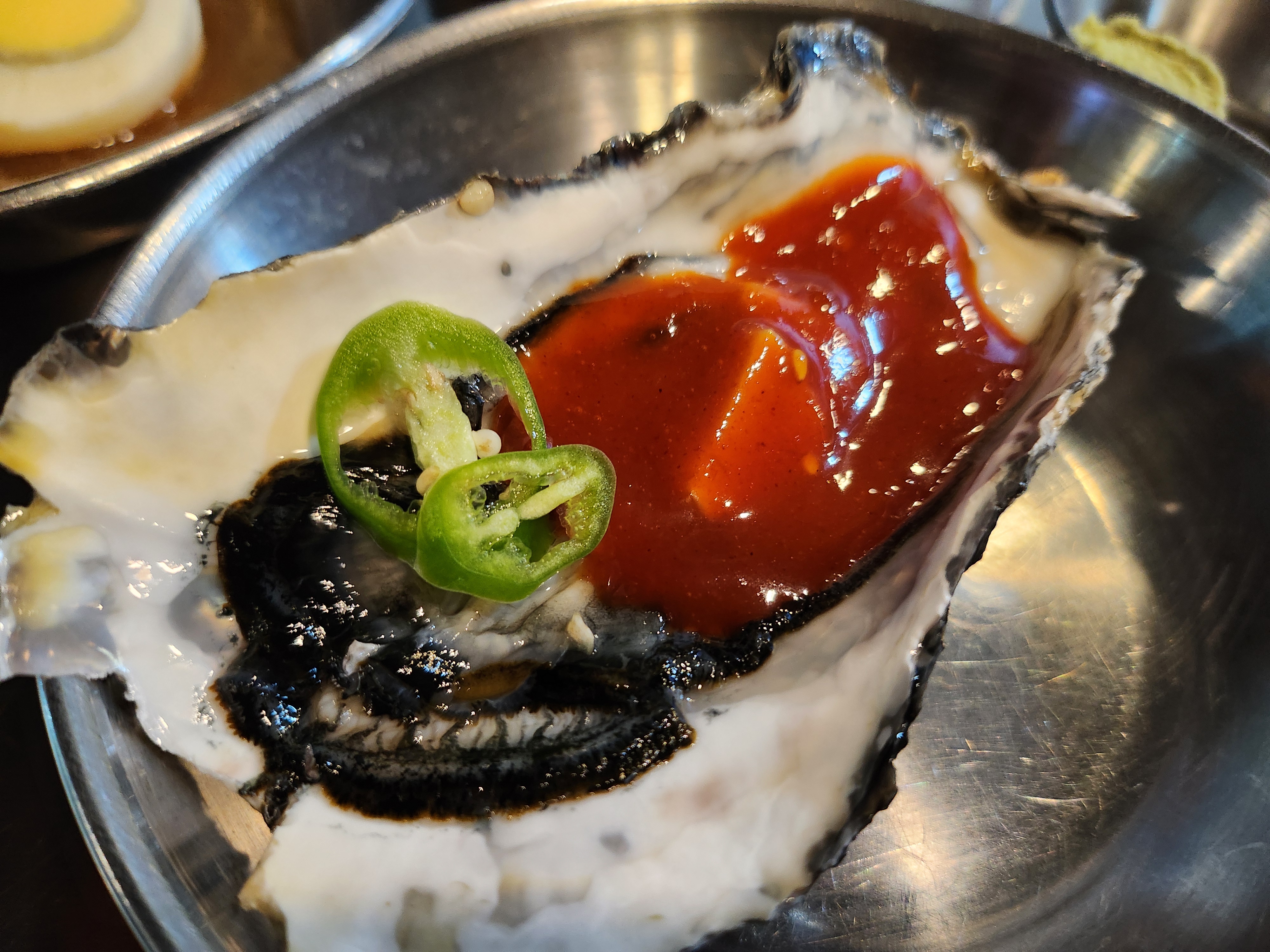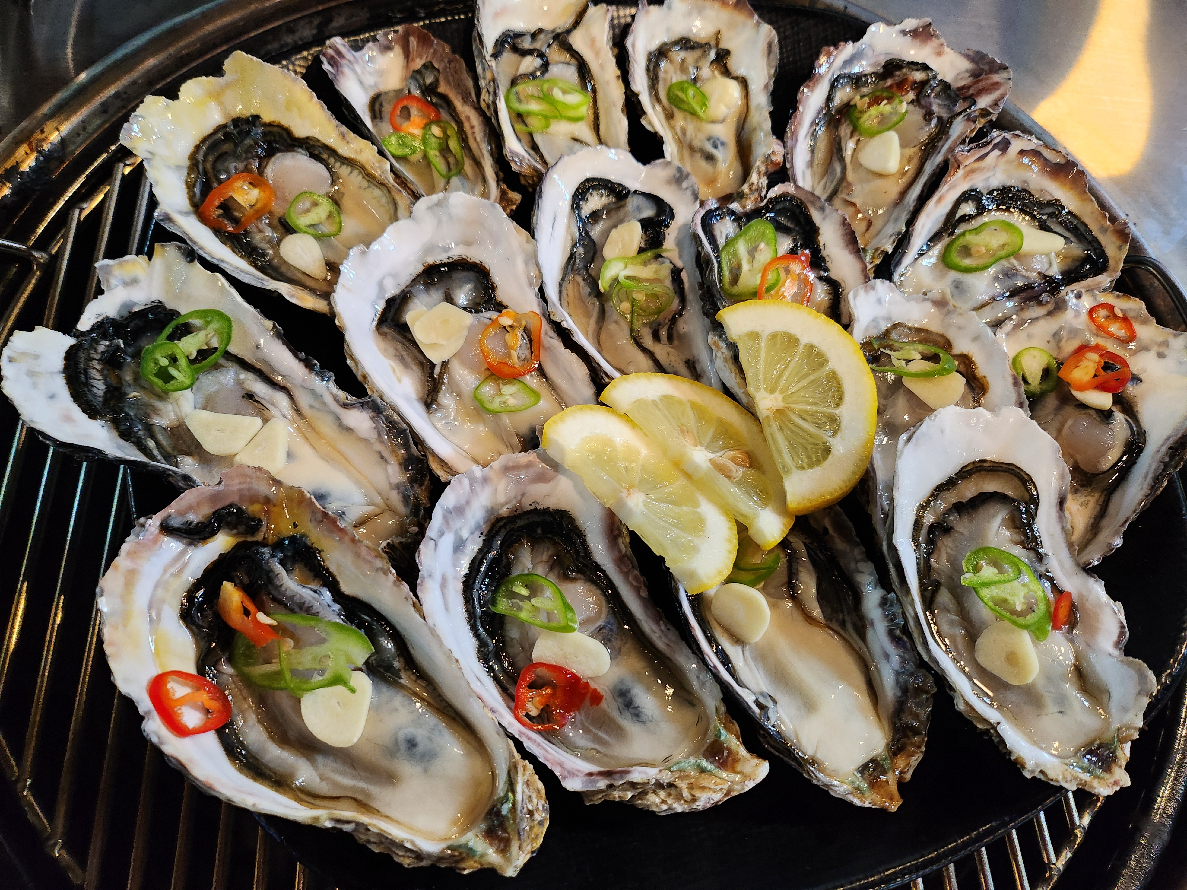 석화 위에 얇게 썬 마늘과 고추를 올려 감칠맛을 더했는데, 한입 베어 물자마자 석화 특유의 신선하고 고소한 맛이 입안 가득 퍼졌어요.