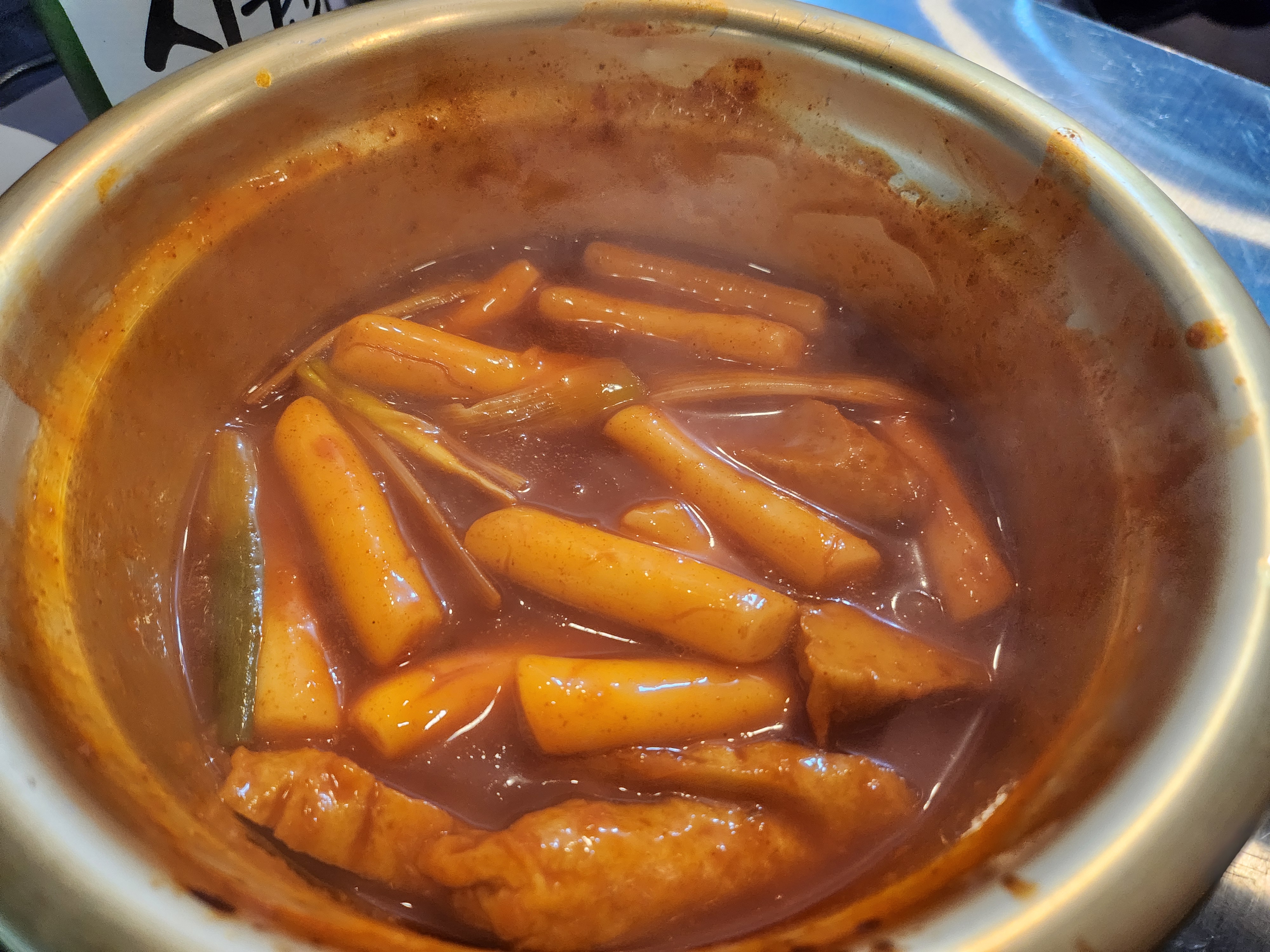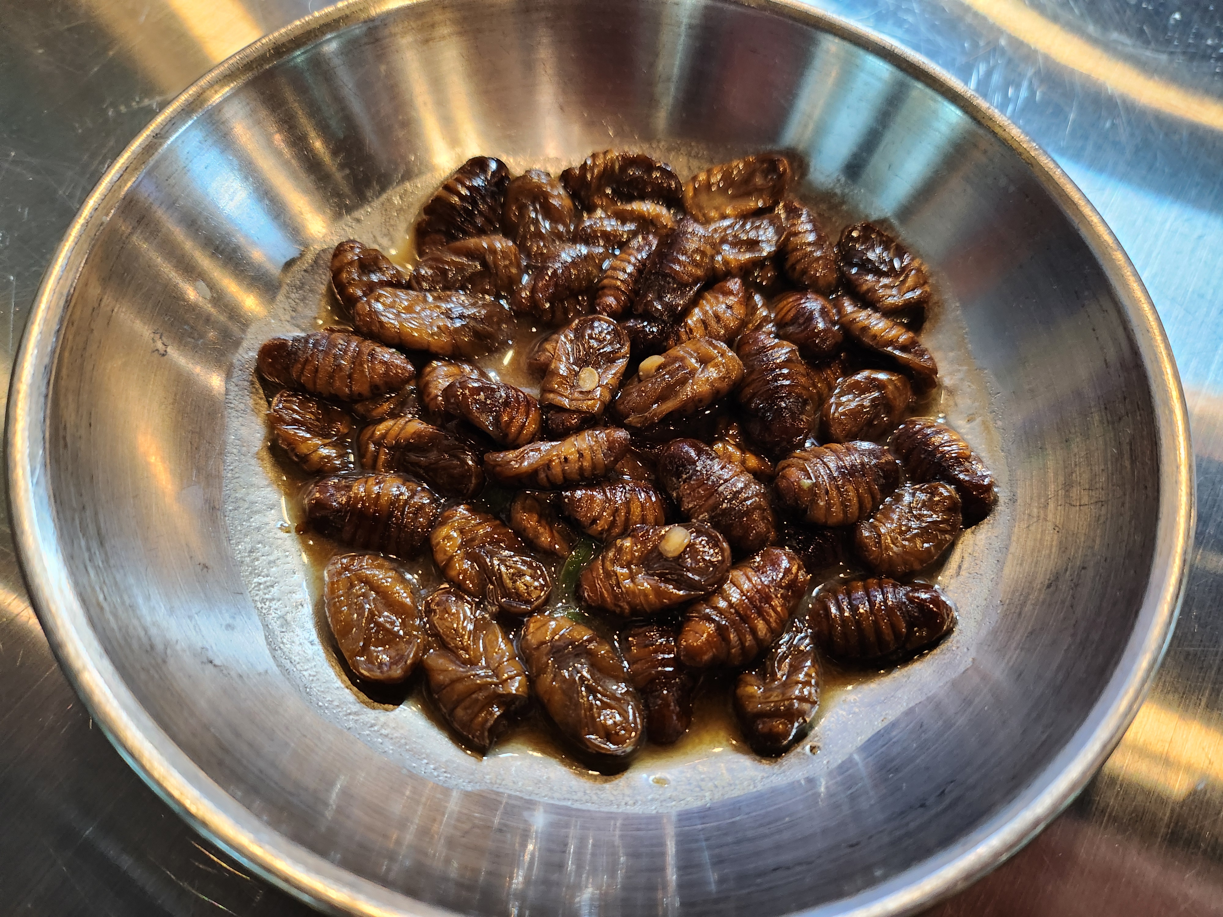 번데기와 매콤한 떡볶이도 기본 반찬으로 나오는데, 번데기는 적당히 간이 배어 있어 고소했고, 떡볶이는 매콤달콤한 국물이 조화롭게 어우러졌습니다.